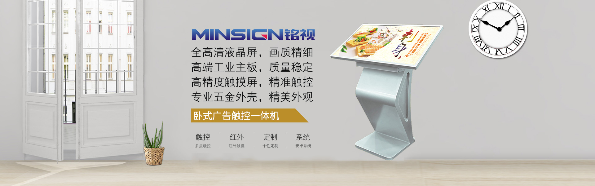 广州铭视信息科技有限公司(简称铭视)是一家致力于智能显示设备的研发、生产、销售的高新企业,主营产品包括液晶广告机、触摸查询机、多媒体播放器等商业显示设备,产品广泛应用于酒店、学校、医院、商场、办公楼等公共场所。产品已经过国家强制3C认证、CE/FCC/Rohs认证,系统软件已获得多个软件著作权证书。自公司创立以来,团队一直致力于产品的创新,通过对软件、硬件的不断升级,增强了用户体验,达到更强的易用性与功能的丰富性,为传统的商业显示设备赋予更多的现代信息科技的生命力 。
